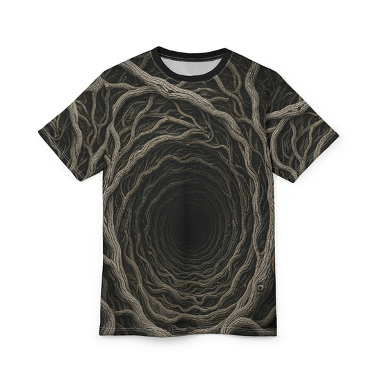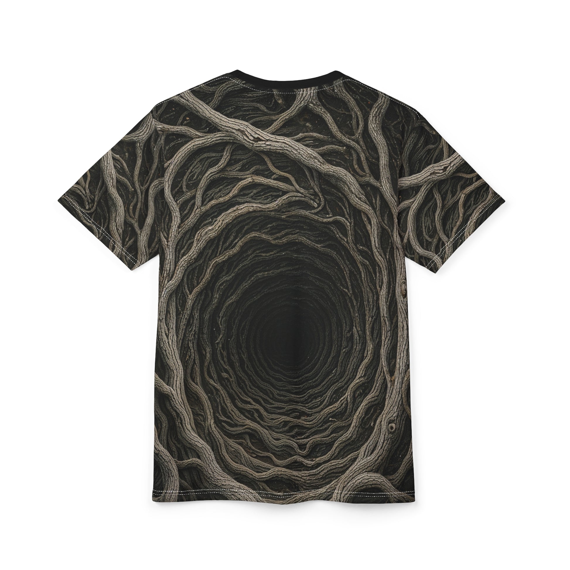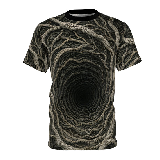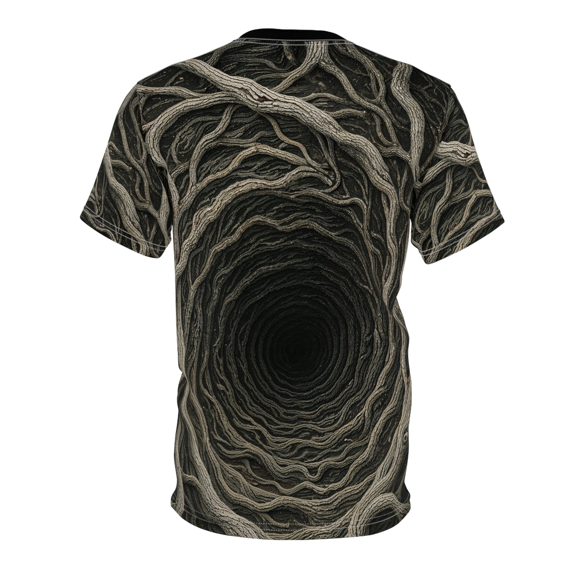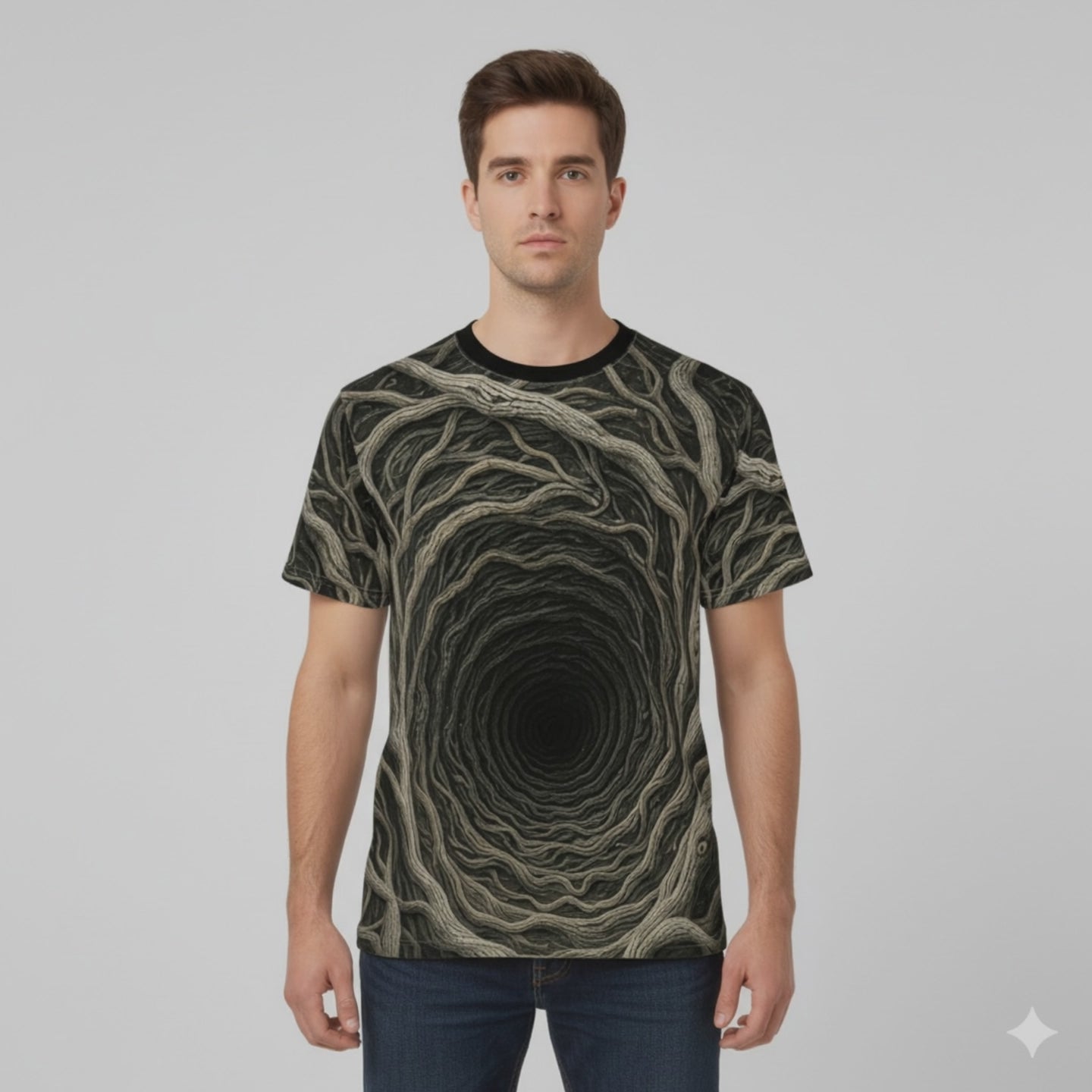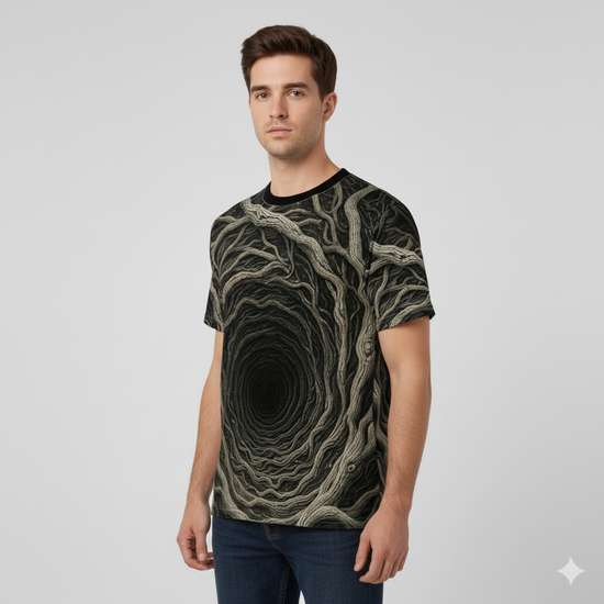 Get lost in the depths of the forest with this stunning 3D vortex illusion shirt. Designed with twisting tree roots spiraling into a hypnotic tunnel, it creates the effect of endless depth right on your chest. A bold, nature-inspired graphic tee that makes a statement at festivals, casual outings, or just everyday streetwear.