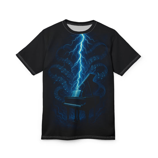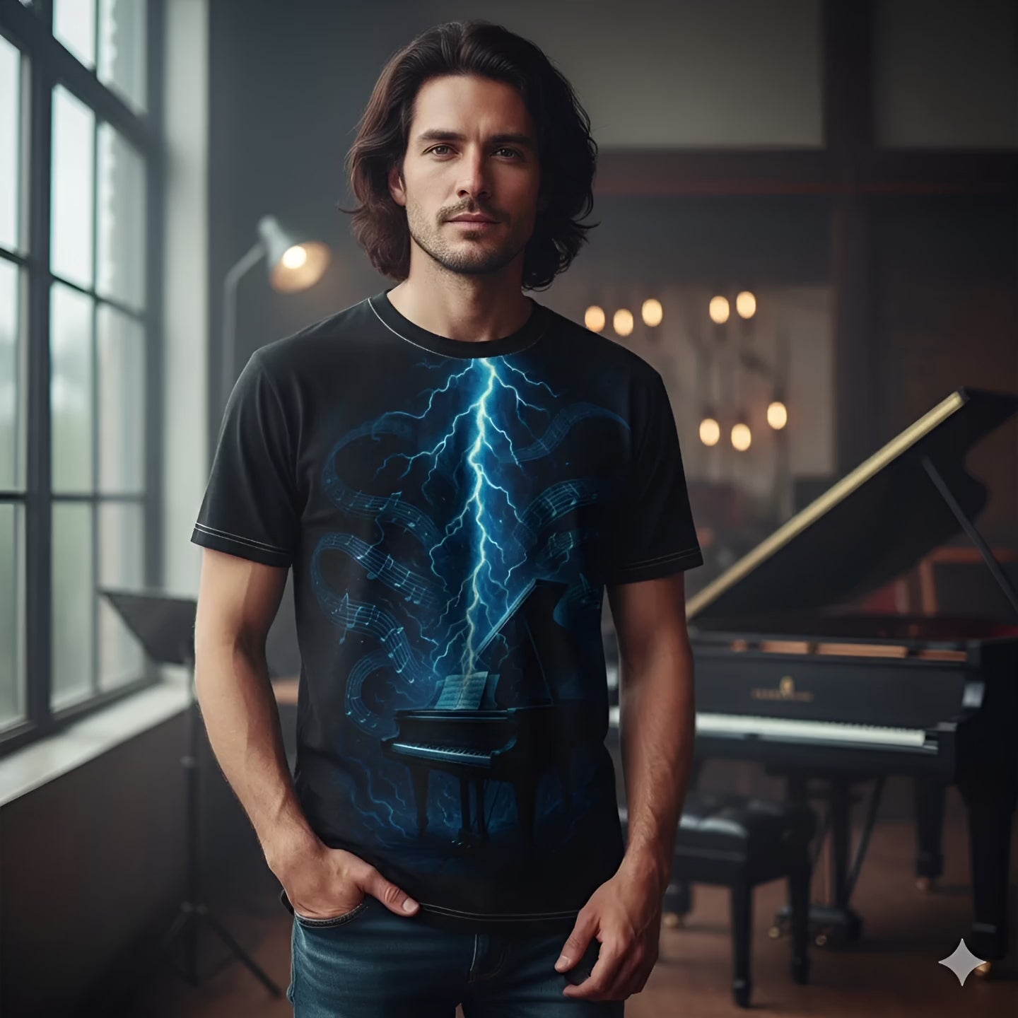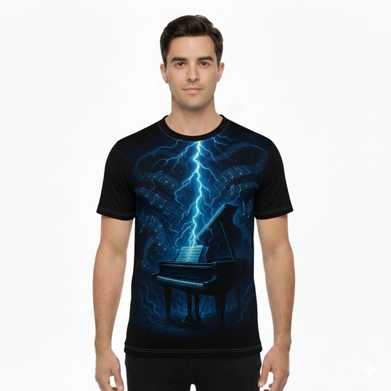 Unleash the power of music with the Piano Lightning T-Shirt, a bold fusion of sound and storm. This striking design features a grand piano illuminated by a bolt of lightning, surrounded by swirling musical notes — a perfect harmony of energy and creativity.