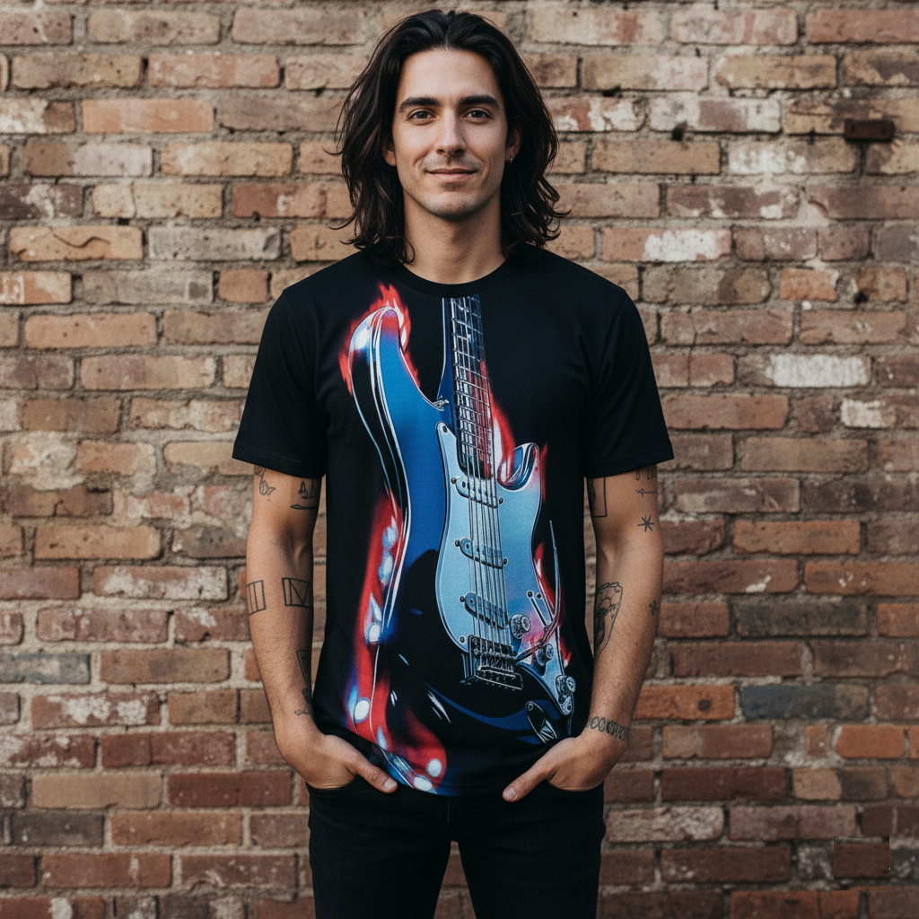 This Electric Guitar on Fire Tee gives off a rock 'n' roll vibe, perfect for music lovers and concert-goers. It can be worn casually or to music festivals and concerts.