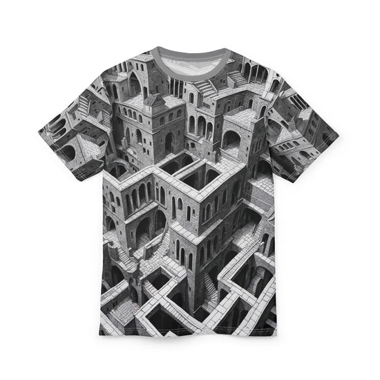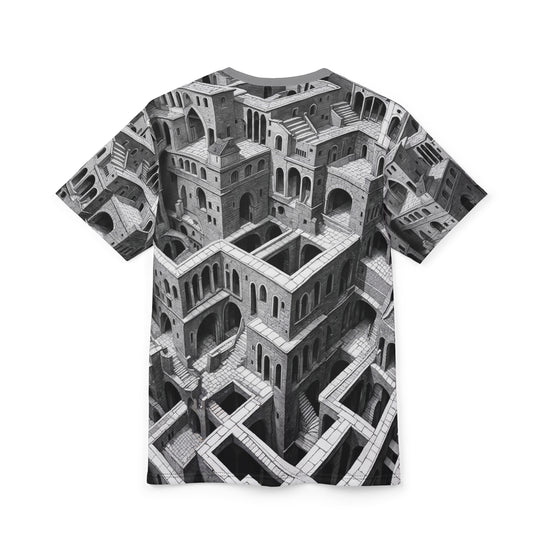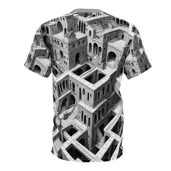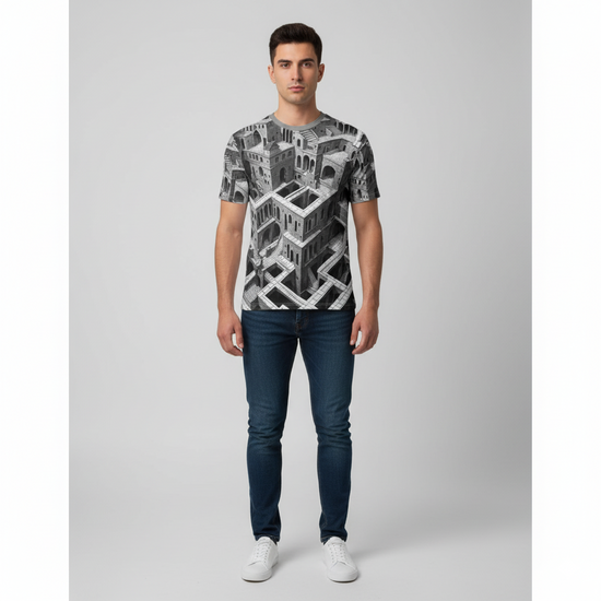 Step into a world of impossible architecture with the MC Escher Optical Illusion Shirt — a striking unisex tee inspired by the legendary Dutch artist’s surreal geometric style. Featuring a bold black-and-white labyrinth of stairs, arches, and structures, this shirt captures the mind-bending perspective Escher made famous.