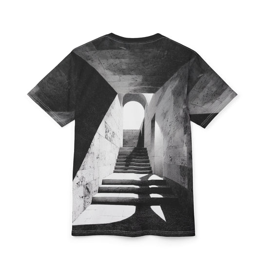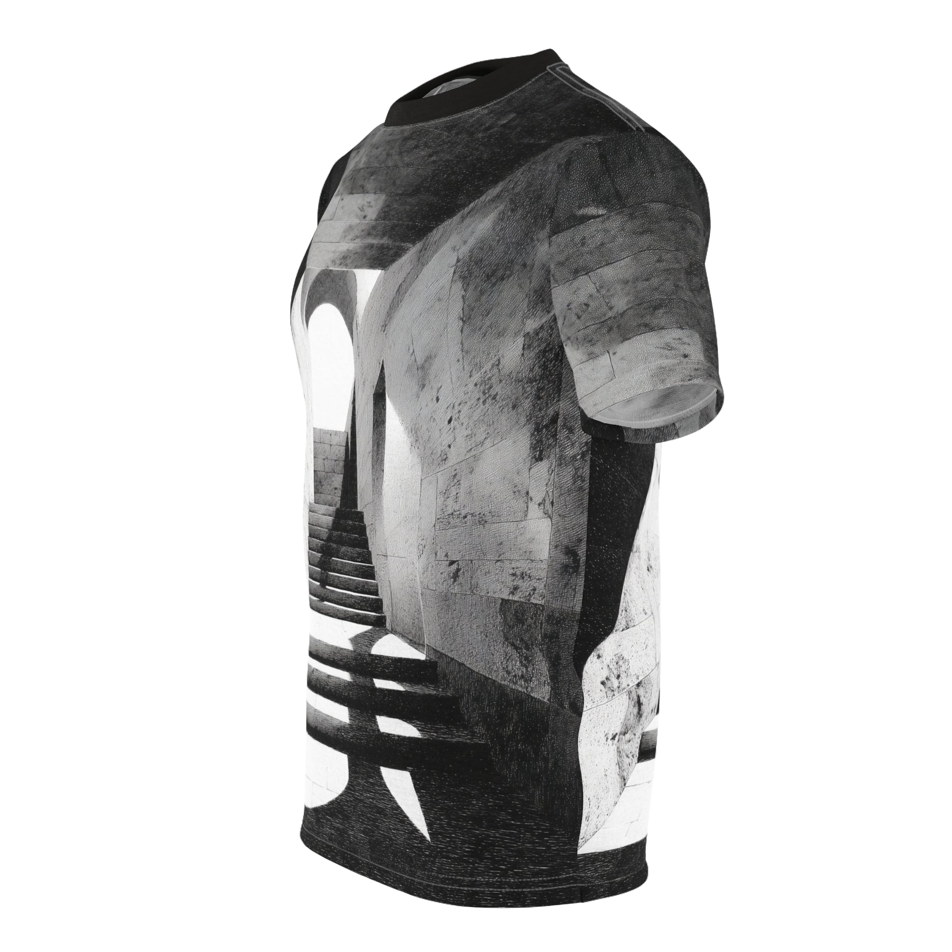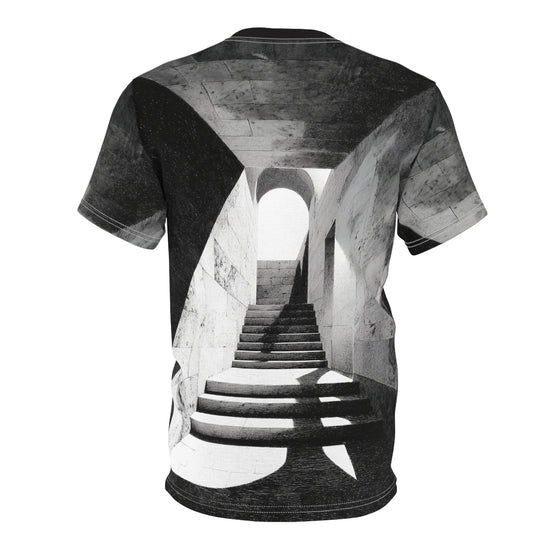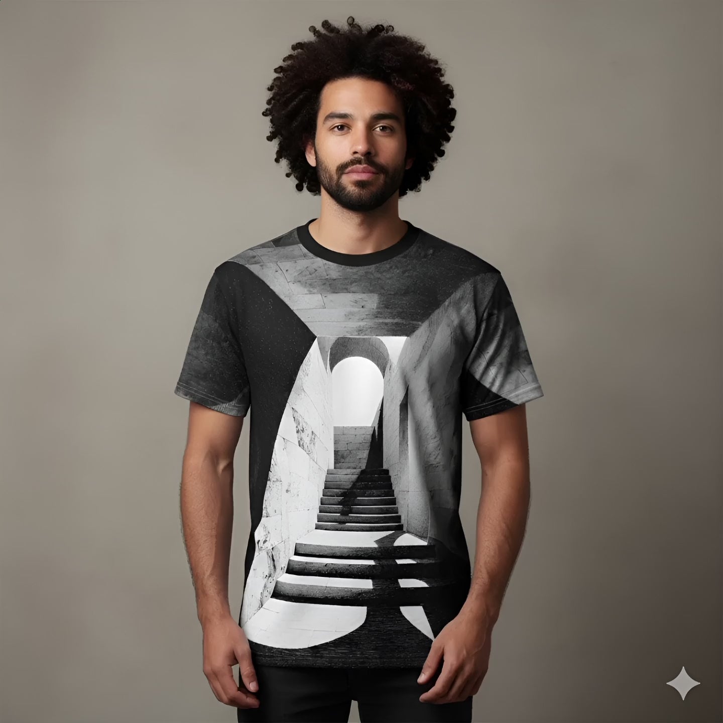 Step into bold surrealism with the Monochrome Stairway Illusion Tee, a striking design inspired by the impossible geometry of M.C. Escher. This shirt features a black-and-white optical illusion staircase that seems to rise and twist out of reality, creating a powerful 3D depth effect.