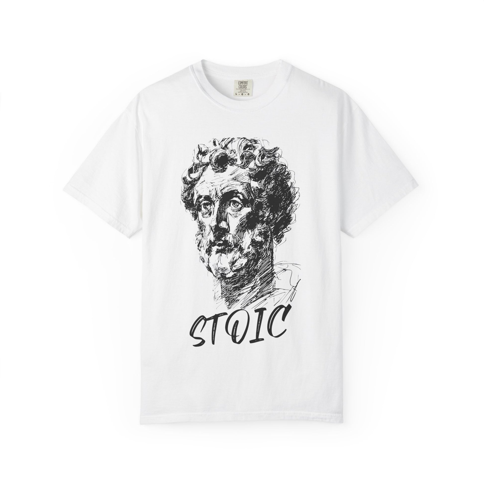 This STOIC philosophy t-shirt features a sketch of Marcus Aurelius, embodying a minimalist Stoicism aesthetic. Perfect for those interested in philosophy and self-improvement, this tee exudes a calm and contemplative vibe. Ideal for fans of Marcus Aurelius or anyone seeking inner peace and wisdom. Relevant for philosophy enthusiasts, students, and those celebrating World Philosophy Day.